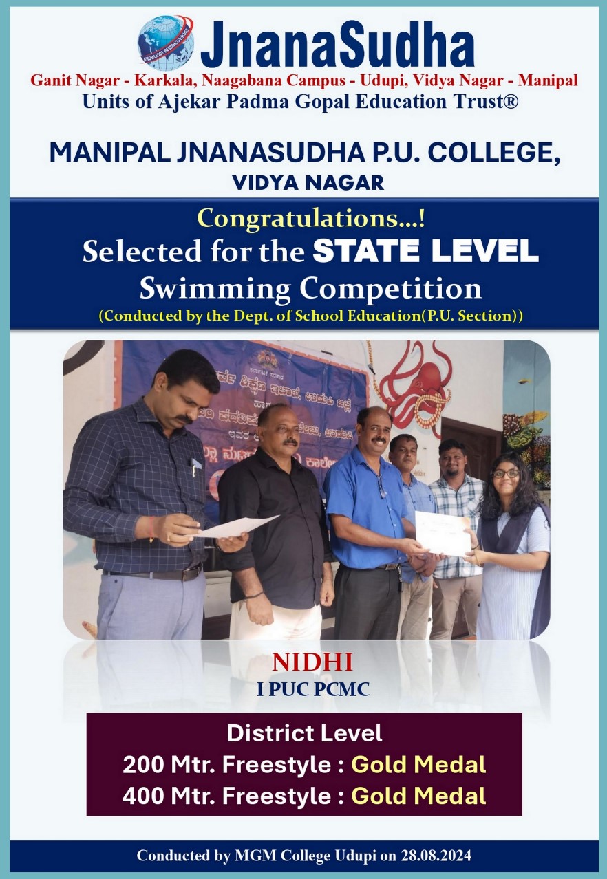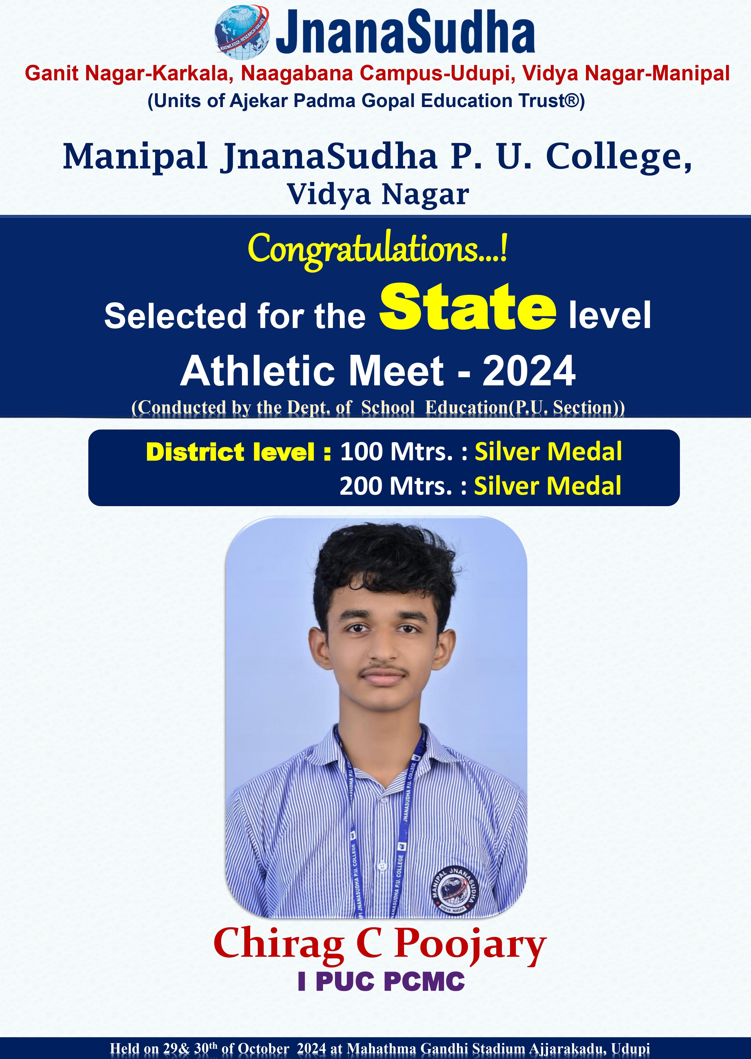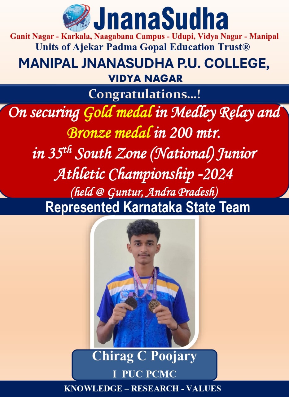 Secured Gold Medal in Medley Relay and Bronze MEdal in 200 mtrs in 35th South Zone (National) Junior Athletic Championship 2024 held at Guntur, Andhra Pradesh Represented Karnataka State Team